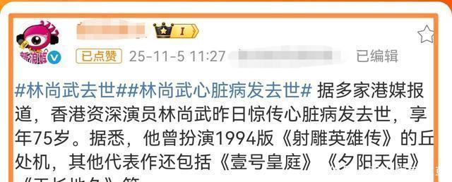 tvb的一个时代真的要结束了吗? 许绍雄、甄志强、冯淬帆,“老戏骨”接二连三的传来噩耗,让网友们的心情久久不能平复。11日,港媒再次报道,知名港星林尚武,也在昨天猝然离世,享岁。